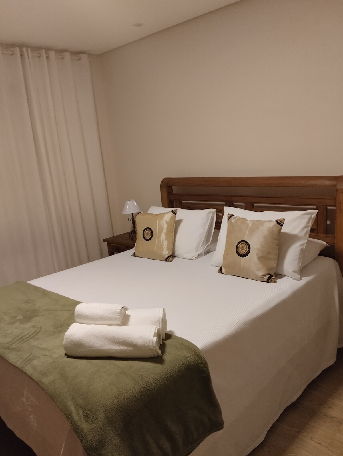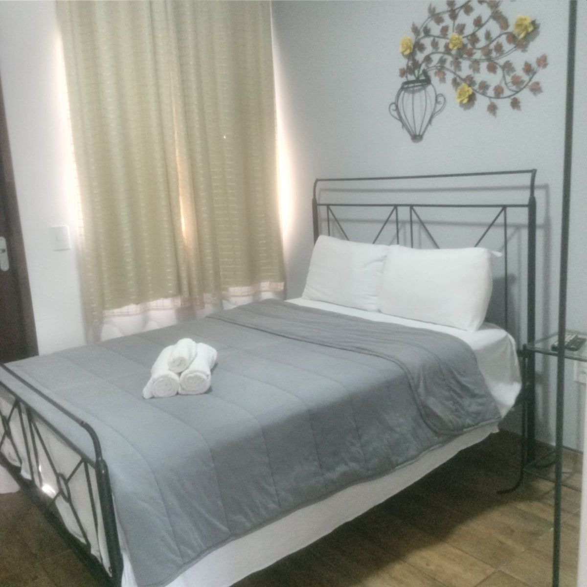 Acomoda até 3 pessoas, com cama de casal e cama de solteiro, TV de canais abertos, Wi-Fi, ventilador, frigobar, closet com cabides, banheiro privativo, além de roupas de cama e banho incluídas.