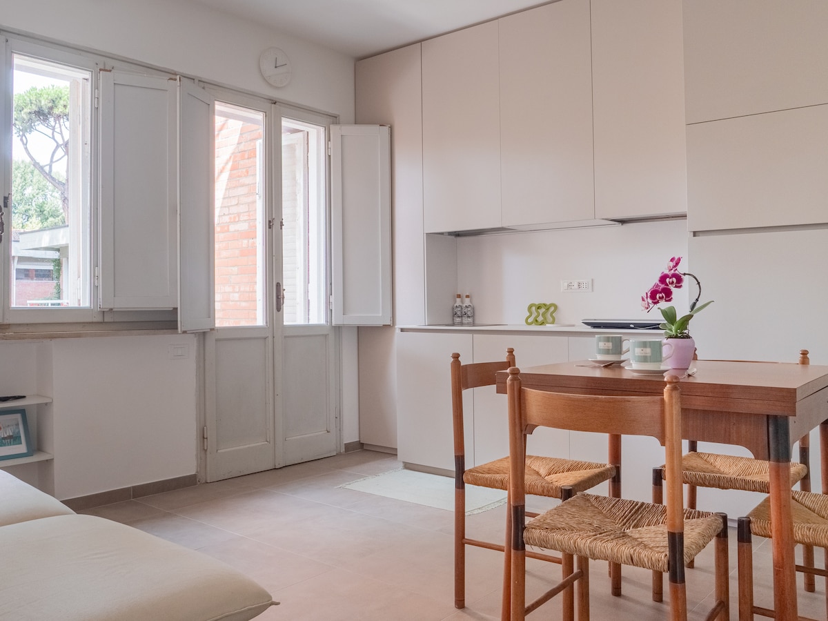 ¡Departamento luminoso y encantador completamente renovado, a 50 metros del mar! Fue mi cuidado personal, como arquitecto, renovar este departamento para que el huésped pudiera experimentar el verdadero espíritu de Marina di Pisa, cuidando el mobiliario y todos los acabados. El departamento consta de recibidor, sala de estar con gran terraza, cocina, pasillo, dos dormitorios y baño. Posibilidad de estacionar el auto dentro del patio del condominio, sin pagar el estacionamiento en la calle.