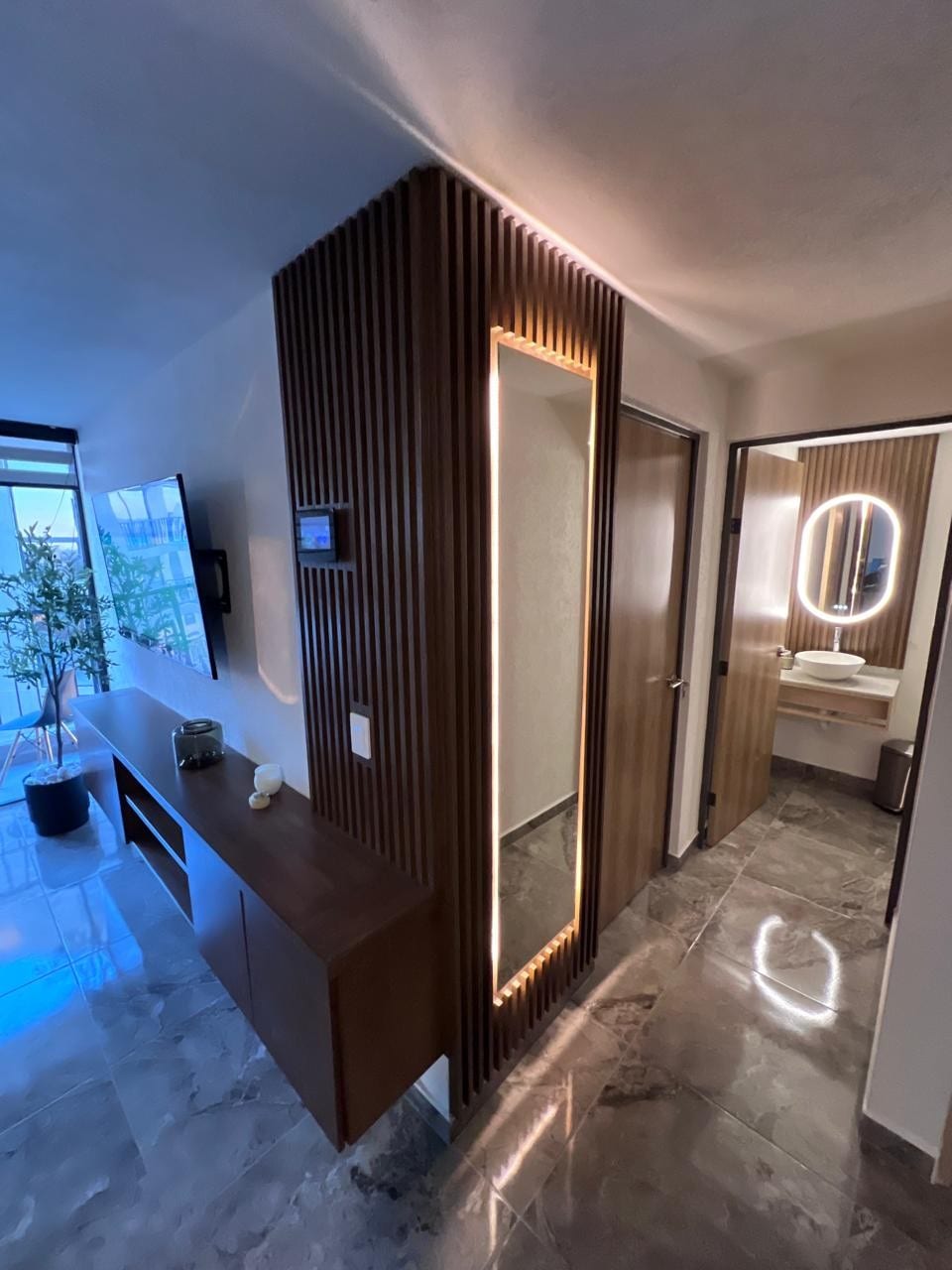Lujoso y hermoso apartamento con diseño art déco y muebles, relajarse y disfrutar de la vista porque está en un noveno piso, cuenta con comodidades como una piscina pintoresca, gimnasio, azotea panorámica, sala social, parrillas para barbacoa, seguridad y ascensores. El apartamento tiene una habitación con una cama tamaño queen, un baño completo, lavandería, cocina completa, nevera con máquina de hielo y dispensador de agua fría. Proporcionamos 2 toallas para la ducha y 2 toallas para la piscina. También ofrecemos excursiones a la ciudad y a pueblos mágicos.