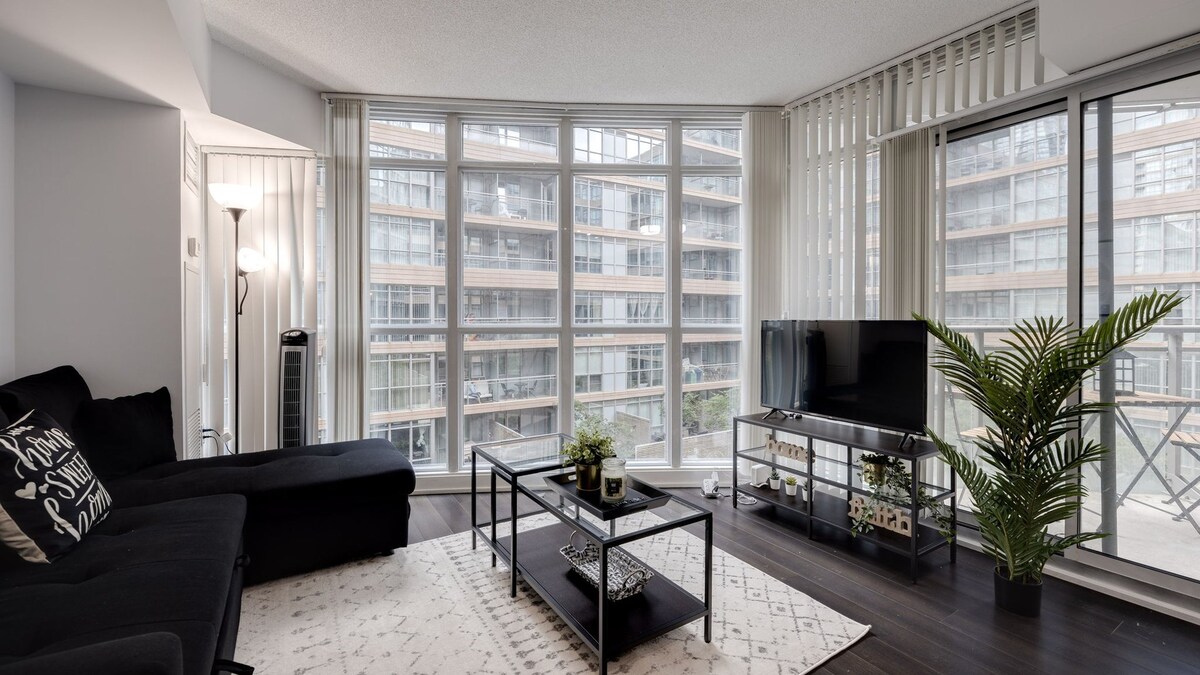 Disfruta del centro de Toronto en esta elegante suite de 1 dormitorio en el corazón de CityPlace. Perfecto para familias o grupos de hasta 5 personas, el alojamiento cuenta con una cama tamaño king, una cama doble y un cómodo sofá cama. Disfruta de un televisor de 55 pulgadas, una cocina totalmente equipada y un balcón privado con vistas a la ciudad. Situado a pocos pasos de la Torre CN, Rogers Centre y la vibrante zona costera, esta es tu base urbana ideal. Nota: Hay estacionamiento público de pago disponible cerca, ya que no se incluye estacionamiento en el lugar.