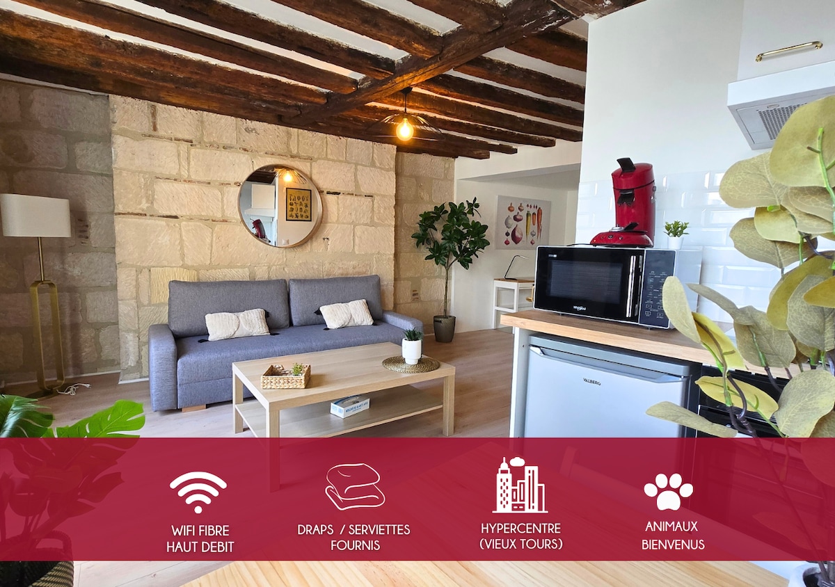 ¡Bienvenido a nuestro espacioso T2 (60 m2) en el primer piso de un edificio tranquilo en el centro de Tours! Idealmente situado en el corazón del centro histórico, nuestro alojamiento, totalmente equipado y reformado, ofrece una experiencia única. - Wifi / Máquina Nespresso / Lavadora / Lavavajillas - Se proporcionan toallas de baño y de cama - Sala de trabajo - Place Plumereau (1 min a pie), Rue nationale (3 min a pie), Estación de tren (15 min a pie) - Llegada y salida 100% independientes ¡Solo tienes que dejar las maletas!
