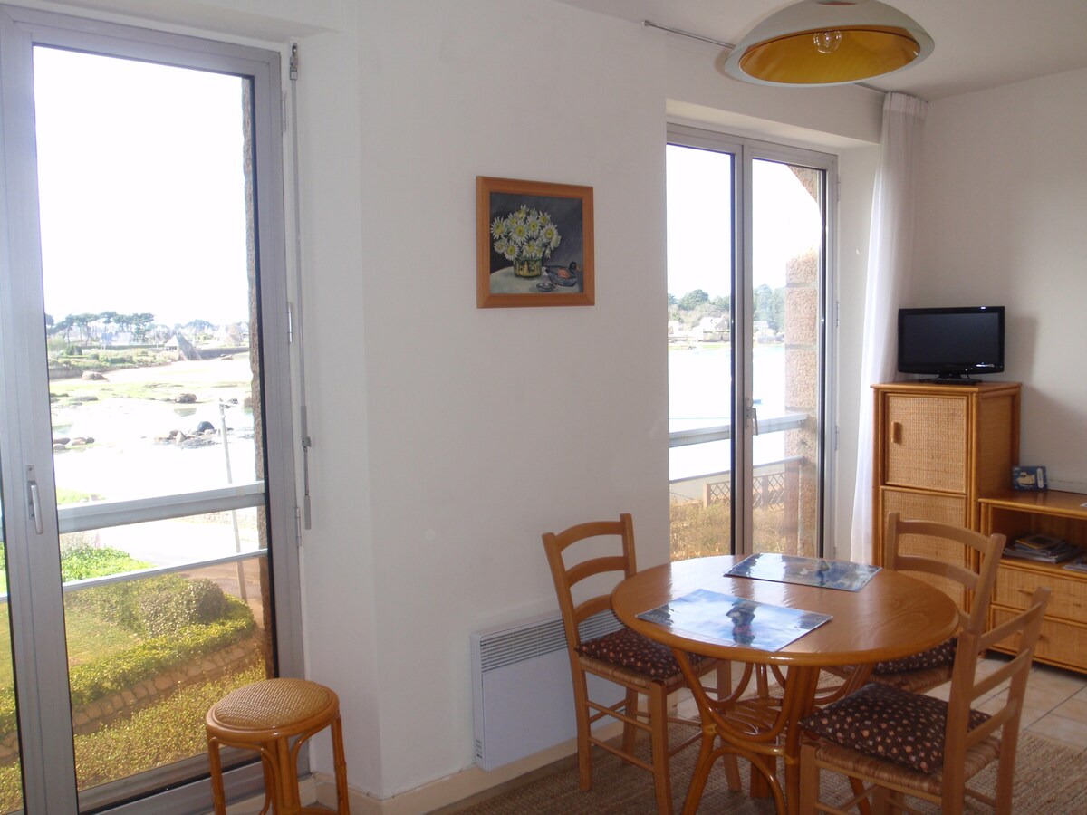 Estudio de 24 m2 con acceso directo a la playa por la residencia y el sendero de los aduaneros GR34 para descubrir la costa de Granito Rosa, Ploumanac'h, Trégastel por tierra y se puede descubrir en barco con las estrellas de las 7 islas. Está equipado con una cocina americana, cuarto de baño con ducha, zona de dormitorio con una cama de 140x190 y una zona de estar con TV. Para sus comidas dispone de un porche y una terraza con vistas al mar. El wifi es gratuito y hay un aparcamiento privado numerado y un guardabicicletas.