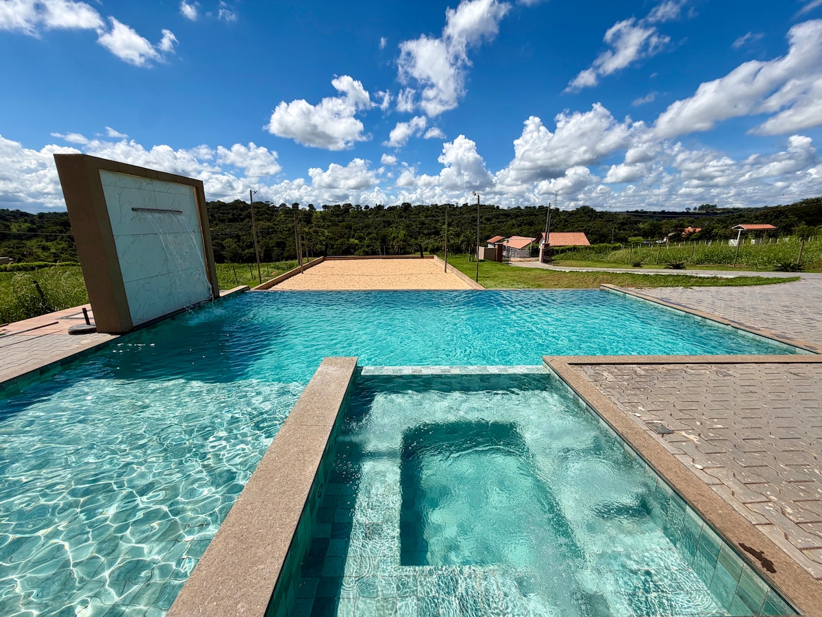Chácara Recanto da Paz, Trindade (Goiás) ¡Disfruta de experiencias inolvidables en una casa de campo totalmente equipada para el ocio y la relajación! Piscina climatizada eléctricamente, infinita, con cascada, jacuzzi e iluminación Bloque de arena para tenis de playa, voleibol y futevôlei. 4 dormitorios con baño y aire acondicionado + sala de estar con Smart TV, Wi-Fi, sofá cama y zona de lectura ¡Cocina totalmente equipada con utensilios, nevera, congelador, parrilla para asar, una acogedora zona exterior y mucho confort para toda la familia!