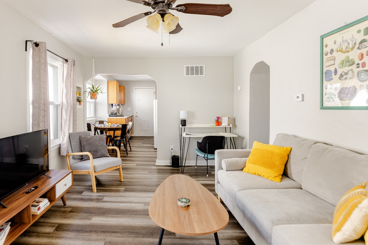 Bienvenido a @RidingHeights, nuestra linda casa bungalow de estilo moderno/bohemio de mediados de siglo. La decoración es colorida, única y funcional. ¡Tiene 900 pies cuadrados con un concepto abierto, una cocina grande y un dormitorio grande con una cama tamaño king! La casa se encuentra a media manzana del sendero Rock Island Trail, es el sendero más largo de la zona. ¡El Heights Strip está a solo minutos! Para tu comodidad, te proporcionamos dos bicicletas de calle. Envíanos un mensaje sobre traer una mascota y lo consideraremos.