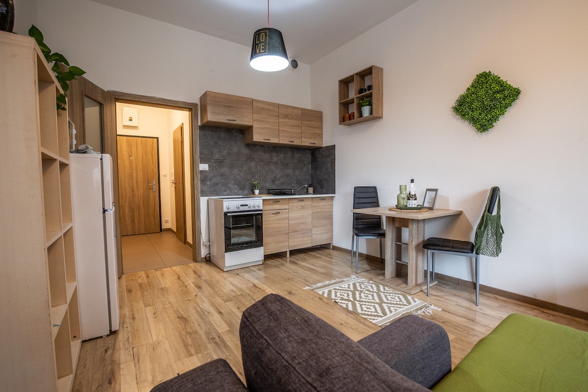 Apartamento de 1 habitación con balcón y aparcamiento gratuito en una plaza de aparcamiento reservada justo al lado de la casa. Apartamento de 30 m2 con vistas a Austria y al atardecer También se admiten animales. Equipamiento del apartamento: - 2 toallas grandes y 2 toallas pequeñas - gel de ducha, champú, - productos de limpieza - café, té El apartamento está situado al comienzo del distrito de Záhorská Bystrica en Bratislava. La accesibilidad es de 2 minutos a pie de la parada de autobús (Krče), 20 minutos en autobús desde la estación principal, 15 minutos en coche