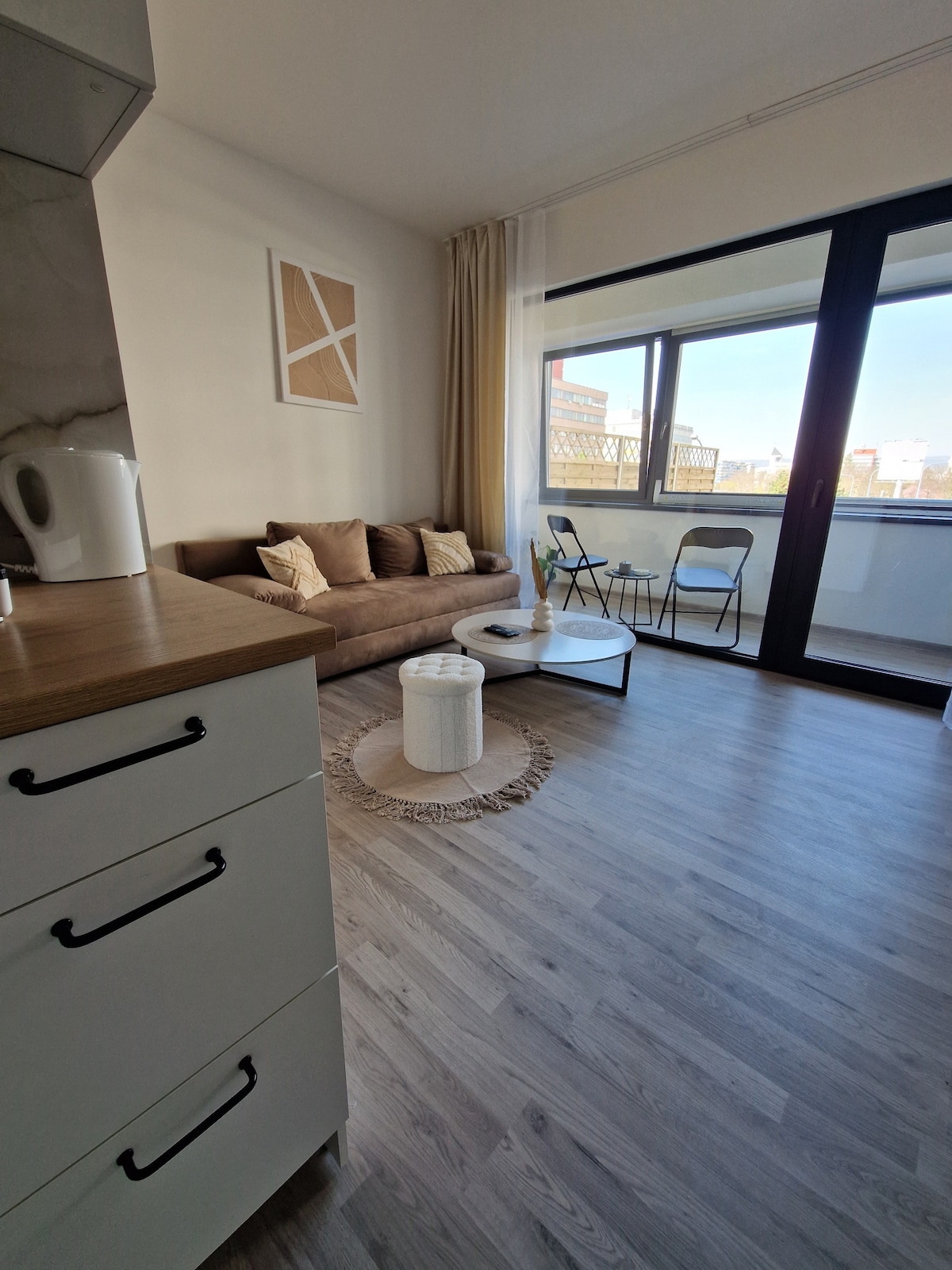 Amplio y moderno departamento nuevo. Está situado a pocos minutos del complejo de la Puerta de Viena, frente a la estación de tren de Petrzalka, con conexión directa con Viena. El apartamento ofrece dos balcones,uno desde el dormitorio y otro del área de la cocina. El apartamento cuenta con una cama doble y un sofá cama donde pueden dormir 2 personas adicionales. El apartamento ofrece sala de estar abierta con TV, internet de alta velocidad gratuito y Netflix, cocina totalmente equipada y baño con bañera grande y lavadora.