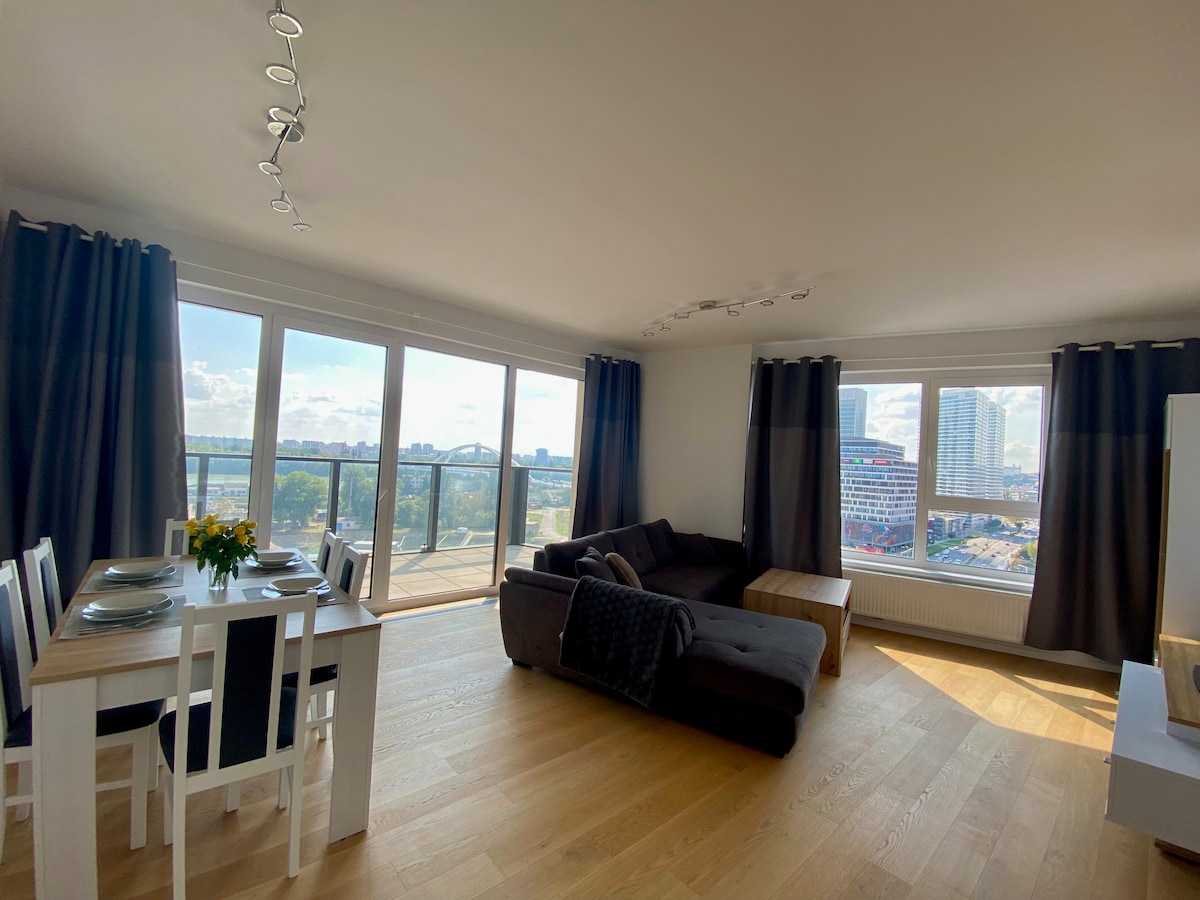 Cerca del centro de la ciudad con una hermosa vista desde el piso 25 de la torre Skypark. El apartamento está totalmente equipado con wifi, TV, cafetera, cocina, nevera y lavadora. Consta de cocina+sala de estar con sofá, dormitorio con cama de matrimonio, baño y balcón con vistas a la ciudad. Ideal para 2-3 personas. El edificio residencial fue diseñado por Zaha Hadid.