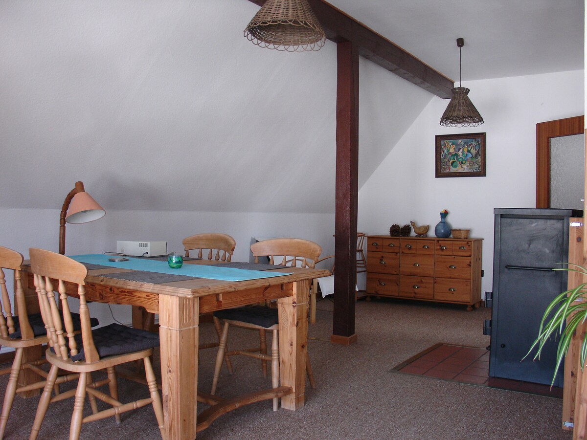 Loft romántico para vacaciones individuales en el mar Báltico. En el corazón de Lütjenburg, no muy lejos de la bahía de Hohwachter, varias playas (5-7 km) te invitan a nadar. Vigas viejas, celosía, yeso crudo. Masonería original y tablones antiguos. La casa es cruda y original, no muy renovada. Las migajas caen del techo y las grietas proporcionan aire fresco. El ático es cualquier cosa menos incómodo. Tiene estilo. Puedes esperar 29 m² de espacio en la casa de entramado 100 años de antigüedad.
