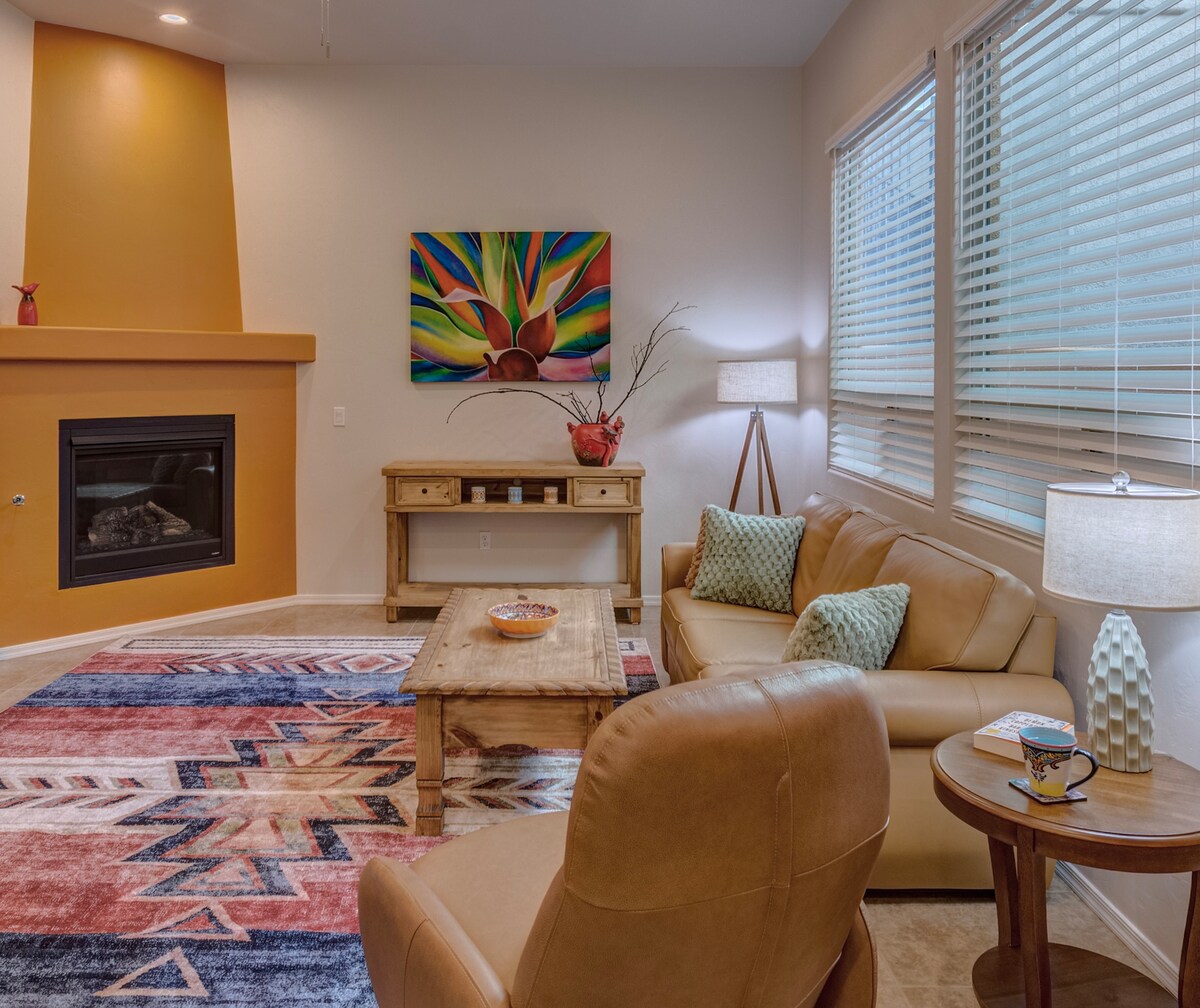 Relájate en nuestra casa adosada que admite mascotas. Es luminoso y cómodo, con patio privado amurallado, parrilla, terraza y estacionamiento en el lugar. Excelentes comodidades, con sábanas y toallas de calidad hotelera. Piscina comunitaria de agua salada y jacuzzi (ambos climatizados durante todo el año). Chimenea de gas interior. Wifi gratuito y un rincón de escritorio para trabajar a distancia. Vecindario tranquilo y seguro. Camina hasta el sendero DeAnza y el #1 Small Art Town en Estados Unidos. ¡Fácil acceso en auto al Tubac Golf Resort! Perfecto para explorar Tubac. Cumple con AZ TPT
