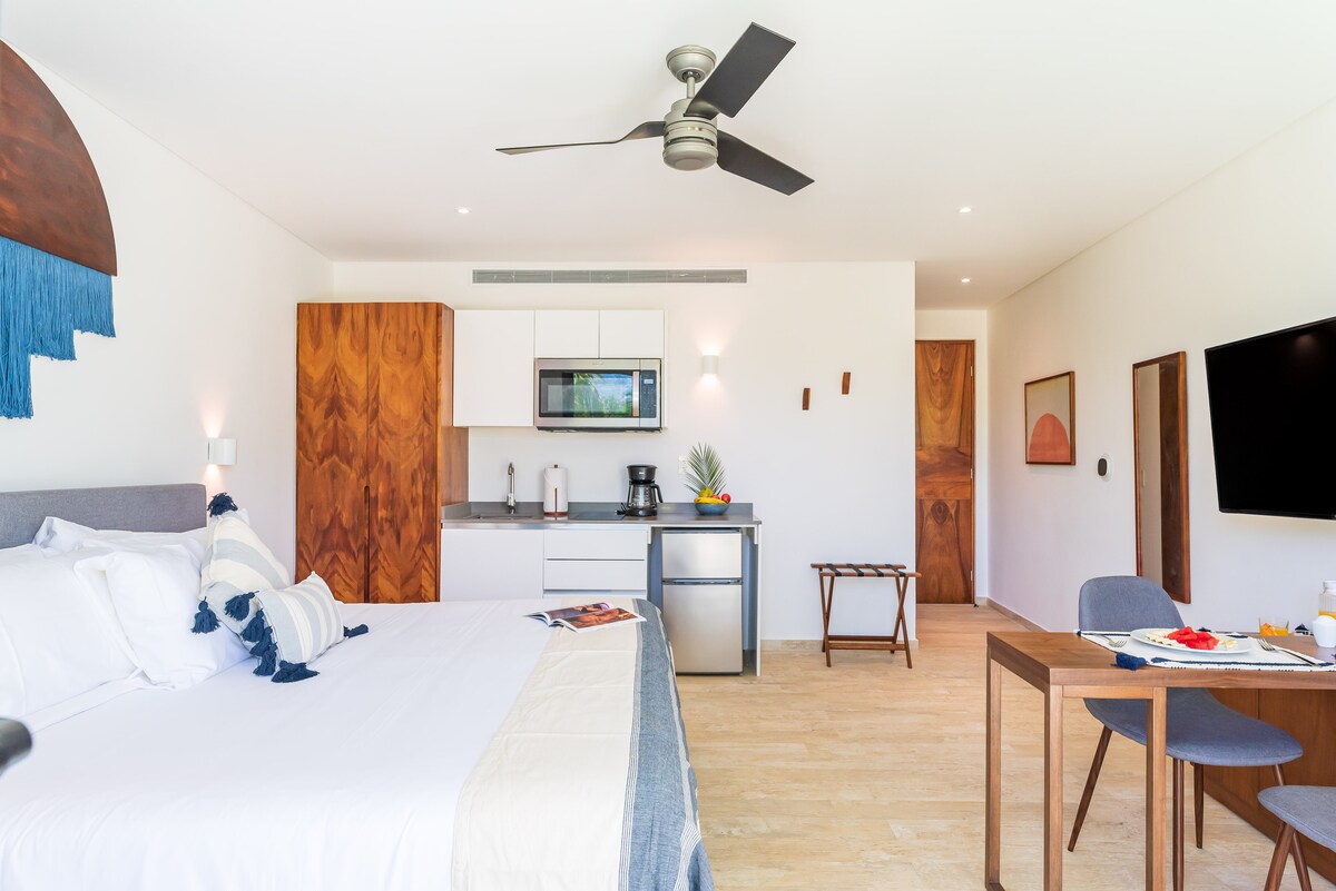 Bienvenido a este estudio meticulosamente diseñado en el vibrante Tulum Centro. Perfecto para viajeros solos o parejas, combina confort, estilo y conveniencia. Con cama king-size, TV inteligente, cocina totalmente equipada y balcón privado con vistas al jardín. Disfruta de la alberca en la azotea, cancha de paddle y acceso a instalaciones artísticas. Tu reserva incluye servicio de concierge sin costo y acceso preferencial a algunos de los mejores beach clubs en Tulum.