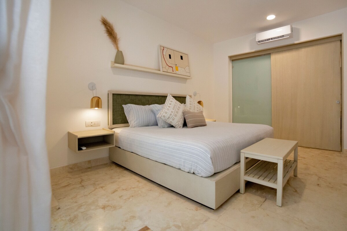 Arte entre 4 paredes, pero no hay límites dentro de nuestra nueva villa de lujo de 1 dormitorio. Como parte de uno de los apartamentos más lujosos y fotogénicos del barrio, nuestro apartamento de 1 dormitorio cuenta con: ☆ Una terraza privada con jacuzzi completo con sofá puff y entrada de puente. ☆ Decoración boho-chic de última generación. ☆ Acceso a una de las mejores comodidades de Tulum, que incluye gimnasio totalmente equipado y con aire acondicionado, 2 piscinas, sala de spa y salas de coworking. ¡Sigue leyendo para ver la lista completa!