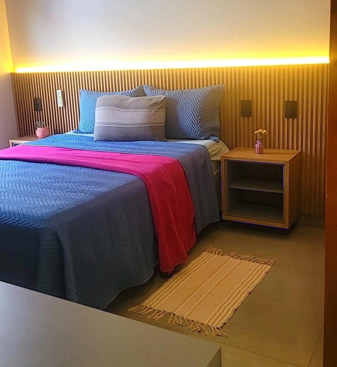 Apartamento con cama doble de 180x200 reversible en 2 individuales de 90x200, sofá cama muy cómodo para pareja o dos usuarios= 1 cama doble de 140x190 (se abre en hoja), TV Android Sony de 49', escritorio, ropa de cama y baño, mini cocina, microondas, nevera 270L, cafetera espresso, cubiertos, accesorios, mesa con 4 sillas, ducha de alta presión, secador de pelo, aire acondicionado central en 2 ambientes, cortinas con black out, vista a la piscina