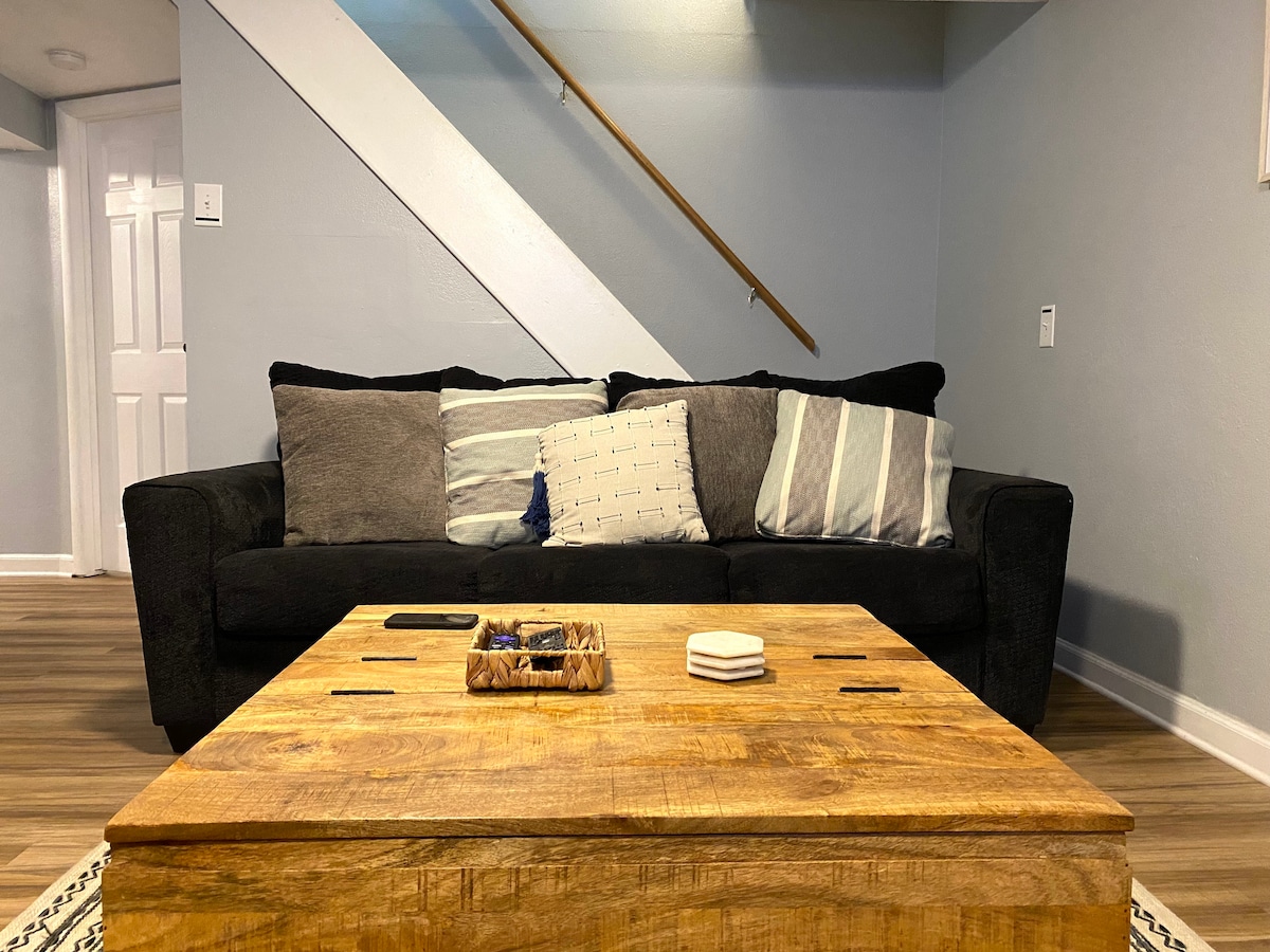 Tendrás este apartamento en un sótano solo para ti (no hay espacios compartidos). Incluye su propia lavandería, cocina americana y televisor Roku. La zona de cocina tiene una estufa de inducción y un horno tostador XL. Vivimos arriba y tenemos niños pequeños. Jugamos, reímos, lloramos y bailamos aquí arriba, pero te proporcionamos una máquina de ruido :) Lee los detalles de la propiedad. Ten en cuenta la disposición del baño y reserva solo si te sientes cómodo subiendo a la plataforma en la que se encuentran el inodoro y la bañera.