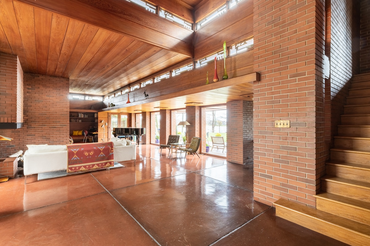 Destacado en Netflix 's, LOS ALQUILERES VACACIONALES MÁS INCREÍBLES del mundo en la temporada 2, ep. 1. Still Bend/Bernard Schwartz House es la versión construida por Frank Lloyd Wright de su diseño Life Magazine "Dream House" de 1938. La casa se encuentra en el río East Twin, a aproximadamente una milla del lago Michigan. Camas: los tres dormitorios de arriba tienen camas dobles y el dormitorio principal tiene una cama tamaño queen.