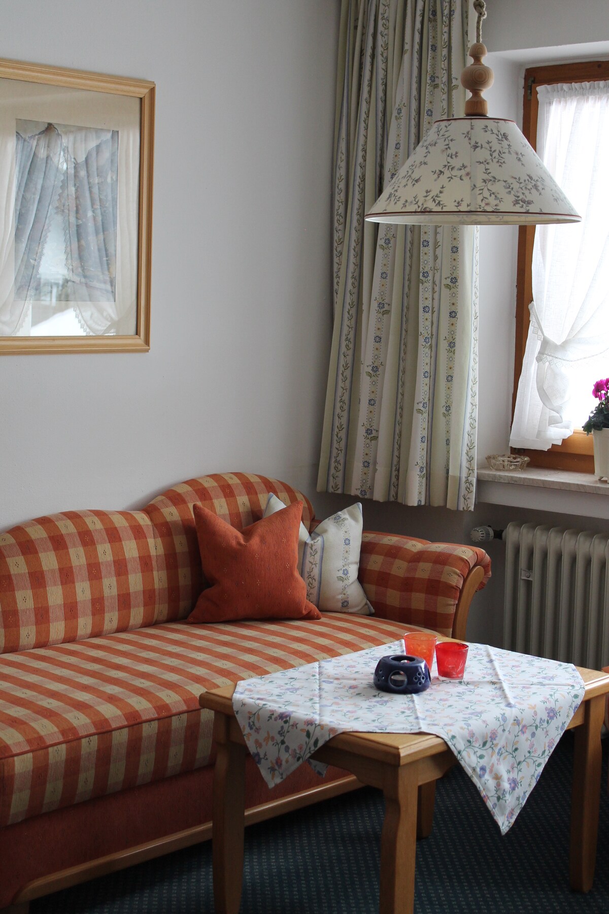 Disfrute de la magnífica vista de nuestra hermosa Karwendel y Wettersteingebirge de su acogedor apartamento con 30m ² Dormitorio con camas Murphy (camas dobles normales, durante el día en el armario, solo hay que ampliar la noche). cómodos asientos y comedor Sistema estéreo SAT-TV Teléfono seguro , cocina independiente que incluye vitrocerámica, microondas, nevera con congelador, cafetera, hervidor y complacido. Vajilla y cubiertos Ducha /secador de pelo WC Terraza sur o balcón orientado al sur con sombrilla y muebles de jardín