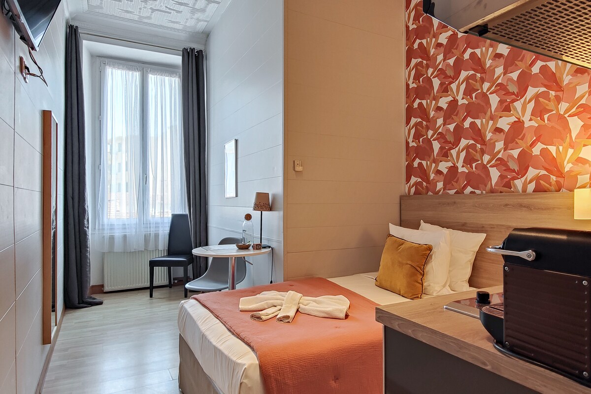Pequeño estudio encantador y cálido en el centro de la ciudad de Niza, en un apartahotel *** con un personal atento en el lugar 24/7. Más que un Airbnb tradicional, le ofrecemos servicios de hotel, una recepción con conserjería, una lavadora (máximo 5 kg, de pago), un depósito de equipaje gratuito antes/después de su estadía. ¡Su ubicación ideal en el casco antiguo de Niza, junto al Teatro de los Franciscanos, es una ventaja! Tenga en cuenta que el estudio se encuentra en el primer piso; sin ascensor (15 escalones).