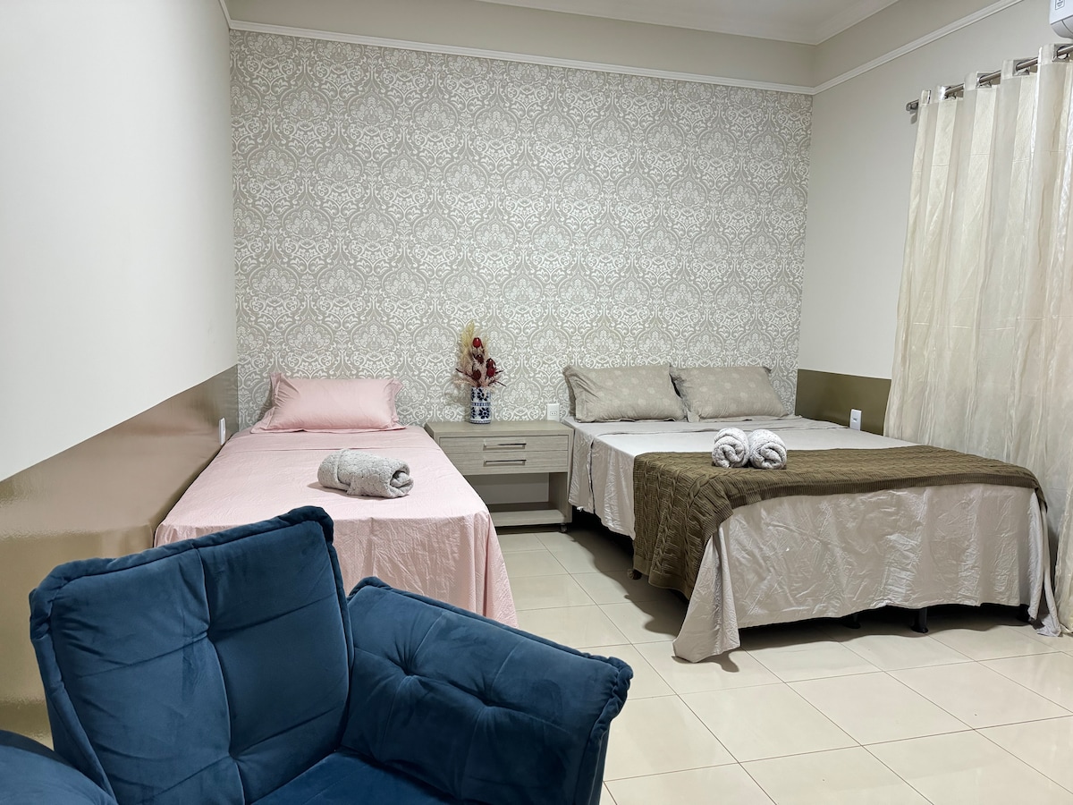 Una casa adosada cerca de todo. El barrio tranquilo nos permite acceder a las avenidas principales y autopistas de Uberlândia. También tenemos panaderías cercanas, buenos supermercados, farmacia, gasolinera. Casa de dos pisos con 1 dormitorio con baño privado, con aire acondicionado en el dormitorio. Baño de invitados (inodoro) Televisión en la sala de estar y wifi Cocina con estufa y horno, filtro de agua, nevera, microondas y utensilios básicos de cocina y lavadora.