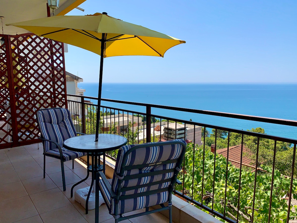 Departamento de dos dormitorios (ático) con una gran cocina y sala de estar. Alojamiento cómodo para un máximo de 5 personas. Preciosas vistas al mar y a la montaña desde una enorme terraza ( 40 metros cuadrados). A 7-10 minutos a pie de la playa. Cocina totalmente equipada, estacionamiento. La recogida en el aeropuerto es posible). Aire acondicionado, TV,lavadora, horno, nevera, secador de pelo, plancha, ropa de cama, toallas.