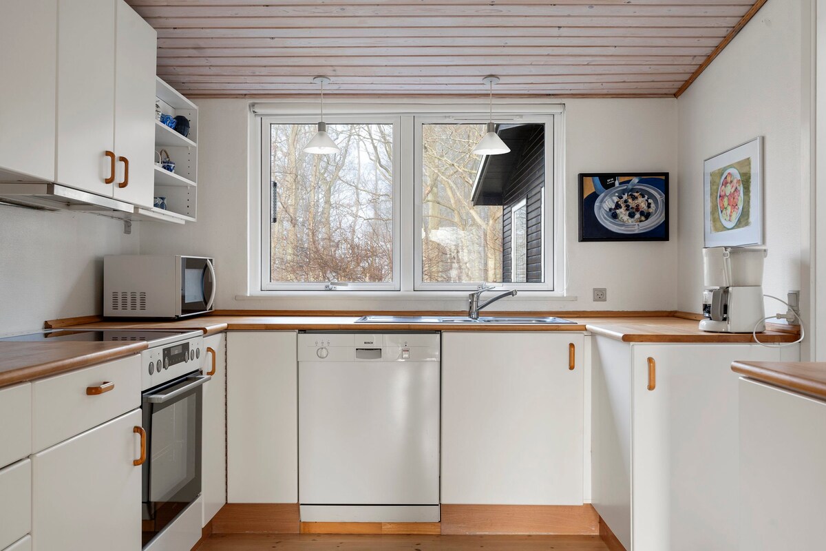Trabajo en curso (ver foto). Escápate a esta encantadora cabaña de madera de 1963 escondida en el Parque Nacional Natural Ulvshale Skov. Perfecto para un fin de semana tranquilo en el bosque. La casa es acogedora, sencilla y está rodeada de naturaleza. Pasea por el bosque hasta la playa o relájate junto a la estufa de leña crepitante. Ducha al aire libre con agua caliente.
