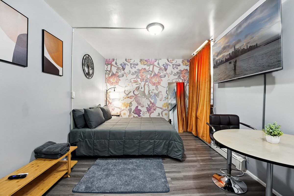 ¡Apartamento en el segundo piso con temática de Nueva York, a solo un tramo de escaleras! Parada de autobús de Manhattan a pocos pasos, llega a Nueva York en 10–20 minutos. Cuenta con una acogedora cama tamaño queen, un sofá cama de tamaño completo en la sala de estar y una silla cama doble en una habitación junto al dormitorio principal. Ideal para 3–4 huéspedes, además de alojamientos para bebés/niños pequeños. Rodeado de restaurantes, tiendas y salones, ¡todo lo que necesitas a solo unos pasos! Podemos proporcionar un pase de estacionamiento público para visitantes si tienes un auto.