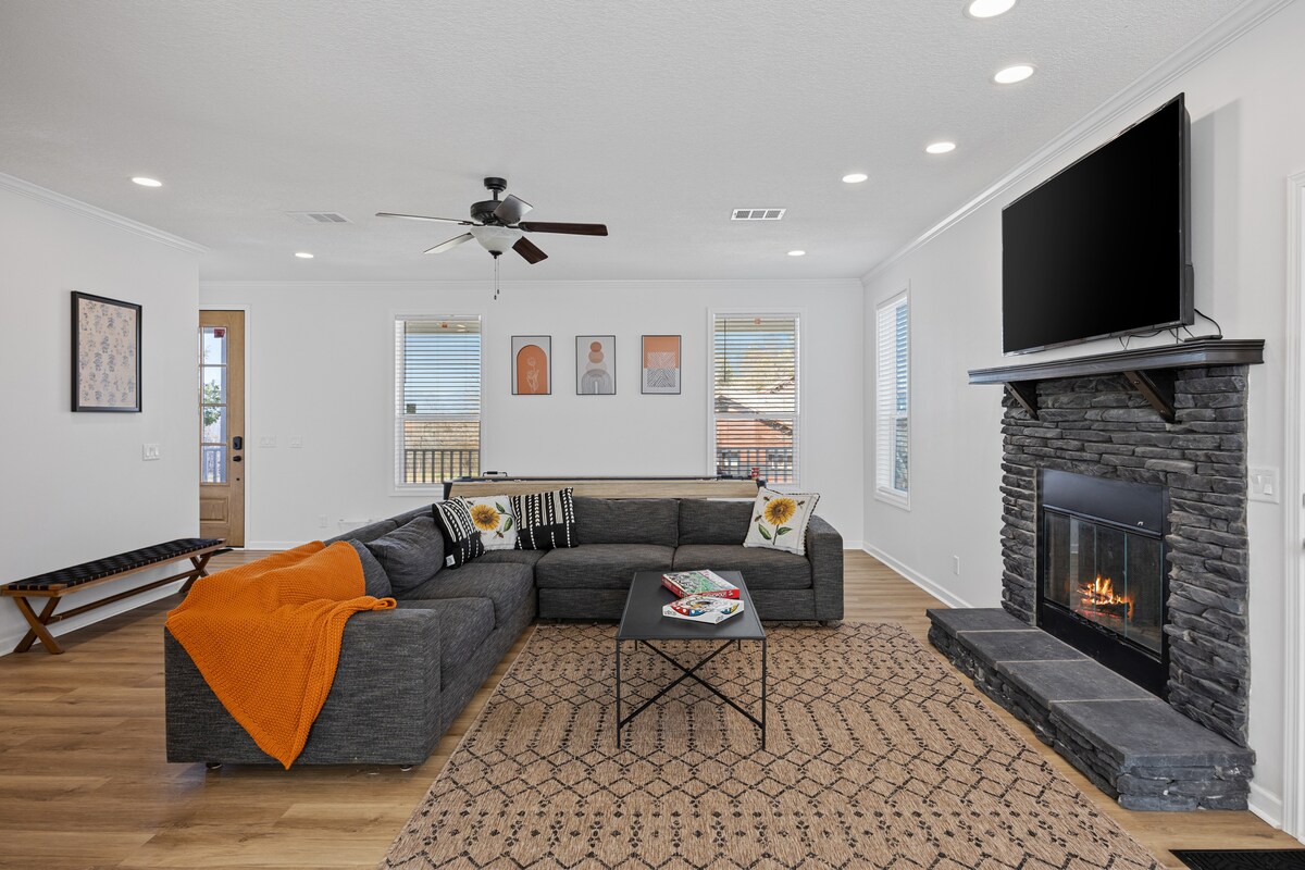 Relájate con toda la familia en este alojamiento tranquilo. Los 4 dormitorios son grandes y espaciosos. Cada uno tiene un televisor Roku. Sala de juegos con mesa de billar, televisor Roku de 65 pulgadas, tablero de dardos y asientos. Cocina y comedor bien equipados en la cocina, el comedor y el patio. La piscina está disponible, pero no climatizada. El spa no tiene calor. La piscina se limpia semanalmente el martes. Hay una red de piscina disponible para eliminar hojas y otros escombros. Los remolques, barcos, casas rodantes no se pueden estacionar en la propiedad.
