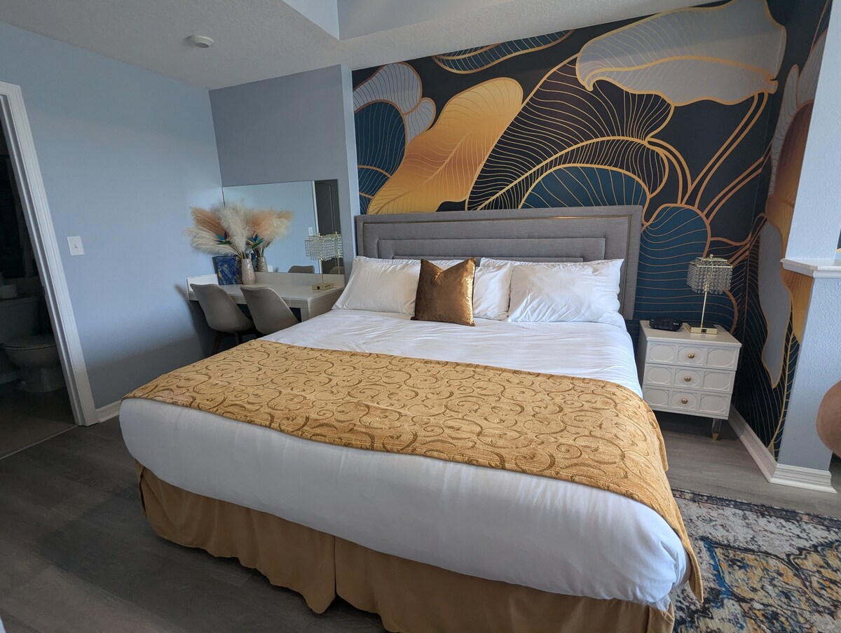 ¡Escápate a nuestro moderno estudio junto al lago para dos! Ubicado en la serena Torre 2, este elegante espacio cuenta con una cama tamaño king, balcón privado con vistas al horizonte de la ciudad y una cocina americana completa. Disfruta del acceso a los servicios del centro vacacional, que incluyen piscinas cubiertas/al aire libre, jacuzzis y un gimnasio. Perfecto para una escapada romántica o una aventura en solitario, que ofrece relajación y comodidad.