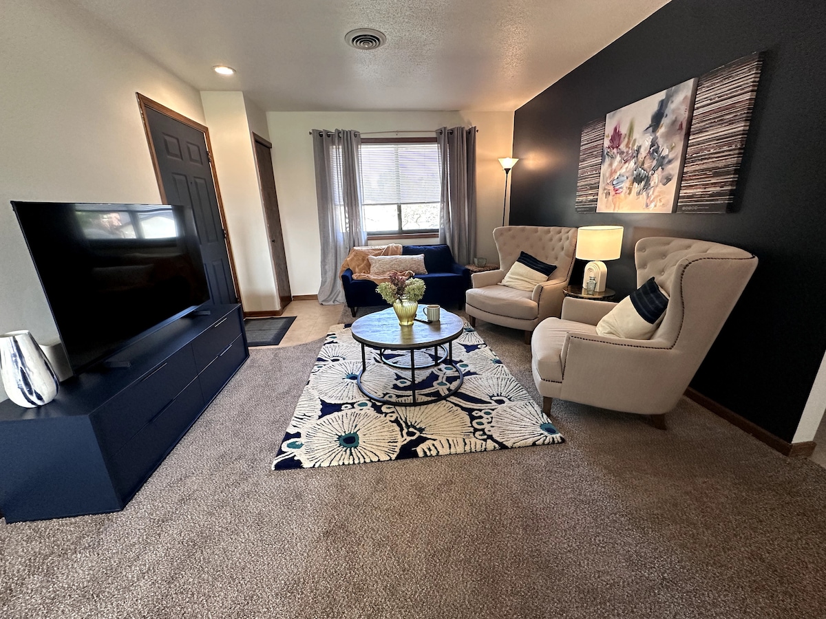 Situado en el centro de la ciudad, cerca de restaurantes, tiendas y servicios. Fácil acceso a la autopista y a 15 minutos de Champaign y de la Universidad de Illinois en una comunidad encantadora. ¡Capacidad para 6 personas! 3 televisores de pantalla plana (42, 48, 55) con dispositivos Roku 4K para transmitir utilizando tus inicios de sesión de streaming personales. Internet wifi alimentado por fibra óptica, perfecto para trabajar y jugar. La gran cocina es perfecta para cocinar y disfrutar. Ten en cuenta que hay 21 escalones para acceder a la unidad del segundo piso. Se admiten mascotas, tranquilo y con privacidad.