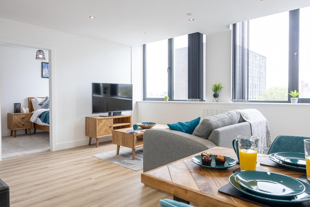 Un nuevo y lujoso apartamento de 1 dormitorio con un sofá cama decorado con muebles de roble de primera calidad. Es luminoso, espacioso y cómodo. Situado convenientemente frente al Emirates Old Trafford y a solo 5 minutos a pie del legendario estadio del Manchester United, ofrece una ubicación privilegiada. Además, a 5 minutos a pie llegarás a la parada del tranvía, que te proporcionará acceso directo al bullicioso centro de la ciudad. Experimenta la combinación perfecta de historia, deportes y entretenimiento durante tu estancia.