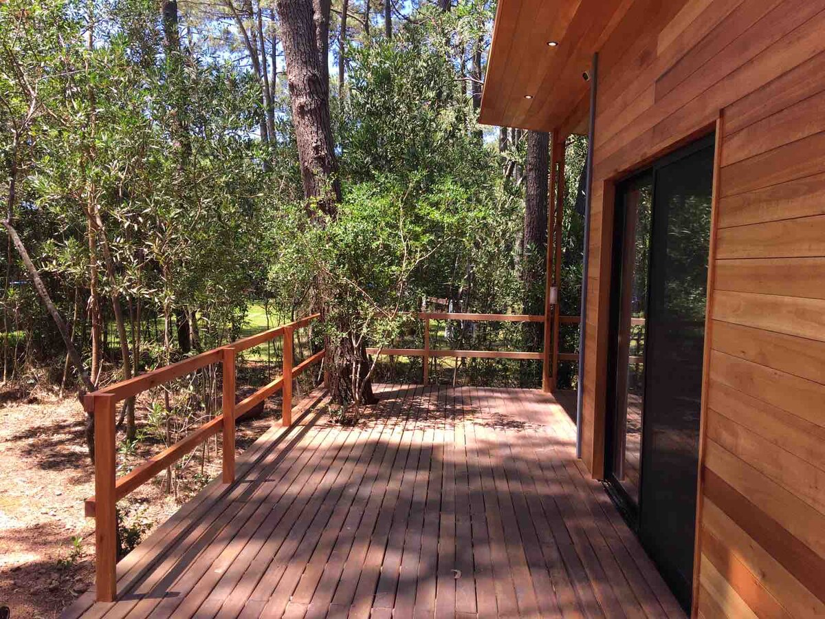 Casitas_del_ensueno: Cabaña a solo 50m. de la playa y rodeada de bosque nativo. En plena naturaleza, está construida con materiales cálidos y de diseño, aberturas doble vidrio, estufa a leña. Amplio espacio abierto con vista al bosque, living-cocina con todo para 4 huéspedes (max. 3 adultos), 1 dormitorio en suite con salida al deck, 2do dormitorio con cama nido (twin) y 2do baño. Wifi por FibraOptica. Pura luz y bosque a un paso del río. Estacionamiento, parrillero, TV, hamaca, sillas de playa.