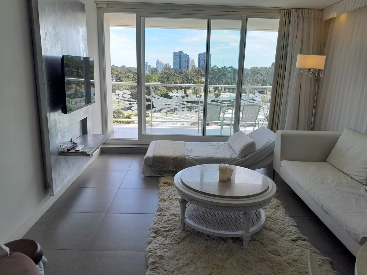 Disfruta de tu estadía en Punta del Este un un apartamento a estrenar en primer piso, con vista al bosque y la piscina. Muy luminoso, edificio excelentemente ubicado, con múltiples servicios, piscina climatizada, piscina abierta, gimnasio, barbacoa, cancha de césped sintético, microcine, sala de niños, adolescentes y adultos, garage cerrado propio, recepción 24 horas, lavadero,wifi, equipado para 4 personas, ropa de cama y toallas de baño, aire acondicionado,2 smart tv 40 "