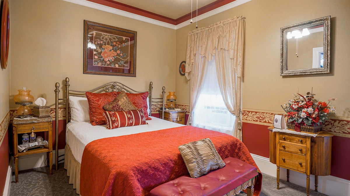 Simple, comfortable second-floor room with vintage iron clawfoot tub and Victorian-Western character. No frills, just honest value in a well-preserved historic home. Perfect for budget-conscious travelers who appreciate authentic charm. Includes: Queen bed, clawfoot tub, TV, Wi-Fi, climate control, bath essentials.