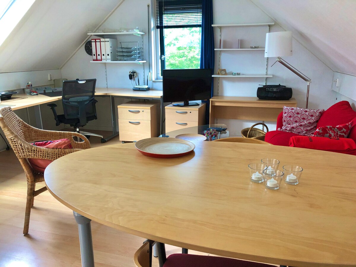 Un estudio autónomo muy acogedor, justo en el centro de Hilversum. Estamos a 5 minutos a pie de la zona comercial y la estación y a 20 minutos de Ámsterdam en tren. Ofrecemos un tranquilo dormitorio loft privado (estilo holandés) con cama doble. En la planta baja hay un baño privado con inodoro, una sala de estar y un área para té/café/ microondas. Hay televisión y WIFI disponibles. Nuestro vecindario alberga muchos bares/restaurantes excelentes y, justo a la vuelta de la esquina, hay un gran bosque para agradables paseos.