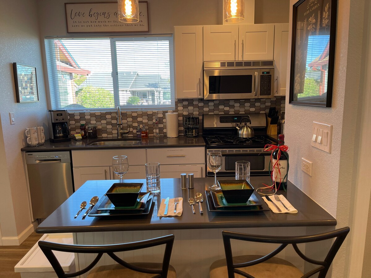"New" (2021) construction and modern private studio located in a great neighborhood in the town of Vacaville in the East Bay Area. Private entrance and easy street parking. Full kitchen with a coffee maker, eating/desk area with bar stools, bedroom area with a KING sized bed, 1 full bathroom, washer/dryer in the unit. There is a flat screen TV in the living area and complimentary fast Wi-Fi. We have soft water too.