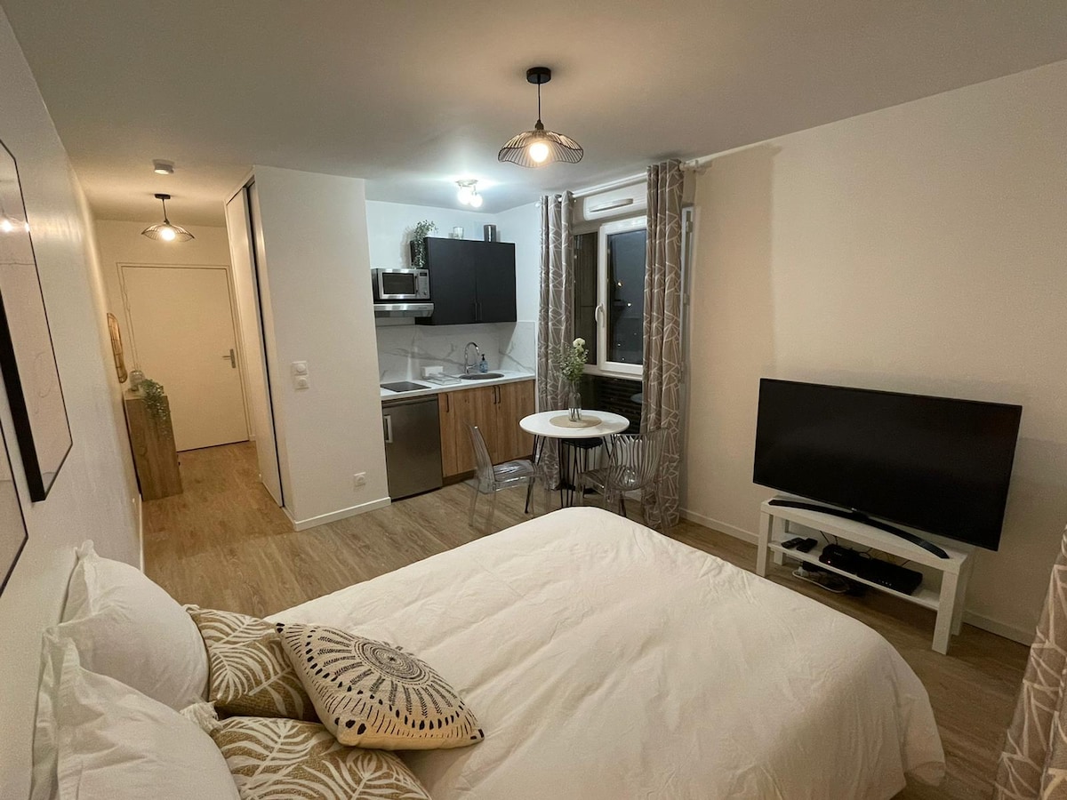 Nuevo apartamento recién reformado. 1 salón cocina con convertible para 2 niños o 1 adulto ,dormitorio con cama de 140 con zona de baño principal con WC. Todo con 1 pequeño balcón El apartamento está bien equipado. Podrá cocinar y, sobre todo, descansar en sábanas limpias y, sobre todo, tranquilas . Las sábanas,toallas y jabones, así como algunos productos básicos para almorzar o cocinar, están a su disposición para su comodidad. 20 minutos a pie de Disney o autobús