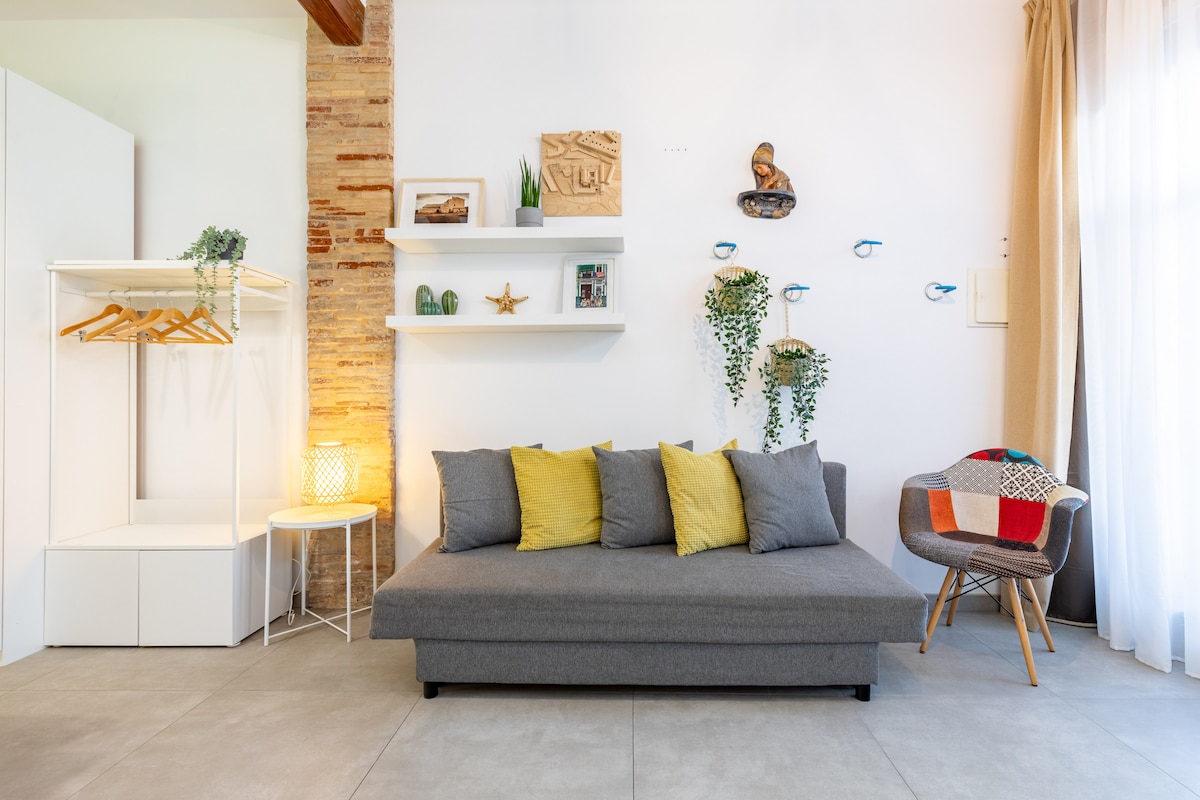 Coqueto y confortable apartamento totalmente equipado muy cerca del mar mediterráneo que puede alojar hasta 4 personas. Situado en la playa de las Arenas. Es perfecto para familias que buscan pasar unas vacaciones de playa pero bien comunicado. A 15 minutos en coche del centro de la ciudad y a 10 minutos de la Ciudad de las Artes y las Ciencias y a tan sólo 18 km del Parque Natural de la Albufera. Tiene Wi-Fi, aire acondicionado y calefacción.