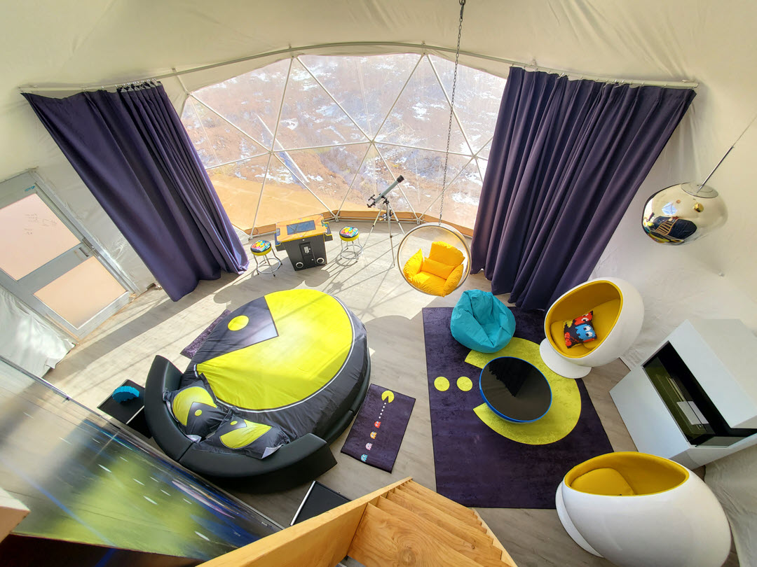 80's VIDEO GAME ROOM DOME (approx 760 sq/ft including the loft) Has 1 oversized round Queen Bed in the main room and 1 Queen bed and 1 Twin bed in the loft For anyone who would like to relive the 80's with a spectacular throwback video game experience, and still enjoy the excellent stargazing of the dome, you will have a killer time in this remarkable room. Have unlimited play of your favorite video games. Bring your camera because you'll want to have some bodacious memories of your time here!