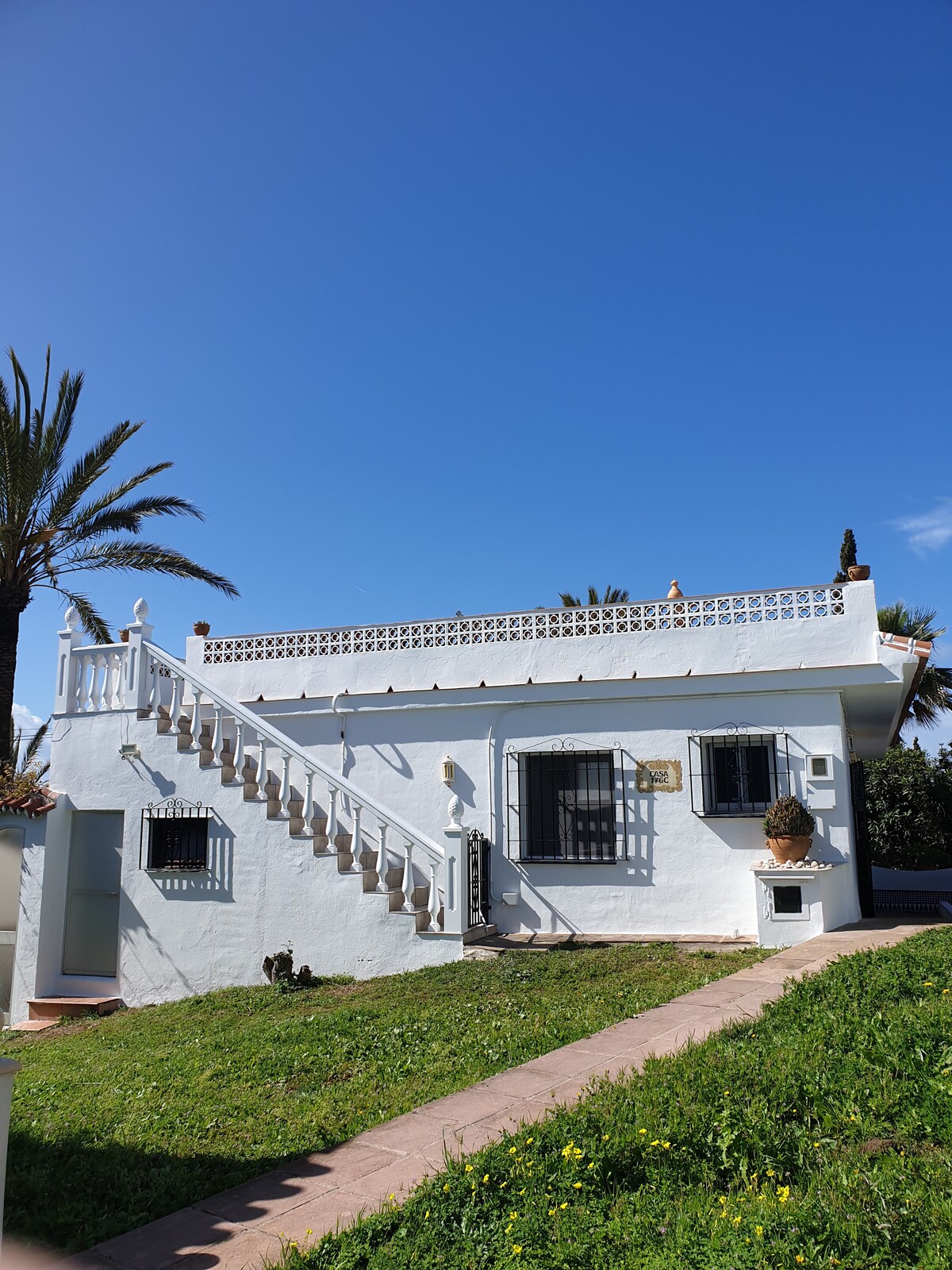 Casa independiente con magnífica vista al mar. Dormitorio: cama de tamaño completo, un baño, estudio grande con sofá para dos y inodoro adicional. Cocina nueva, totalmente equipada. Wifi de 5 Ghz, escritorio para PC. La sala de estar y el estudio se abren al gran patio. Escaleras externas a la azotea. Elección única de campos de golf en el interior. A 8 minutos a pie de la playa "nuestra", a 10 minutos en coche de las interminables playas de Cabopino o Fuengirola. Mantenimiento y ayuda garantizada por la excelente colaboración con nuestros vecinos Superanfitriones españoles.