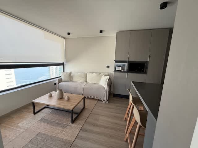 Departamento nuevo en primera línea de 70 mts2. Cuenta con 2 dormitorios, el principal con vista al mar y el otro interior. 2 amplios baños, el principal en suite. Está equipado muy por sobre la media de departamentos similares: Cerradura electrónica sin llave, living con sillón cama full y Frame TV en el muro del living. La cocina es americana completamente equipada. La terraza tiene parrilla a gas, es muy amplia y con vista completa a Playa La Boca.