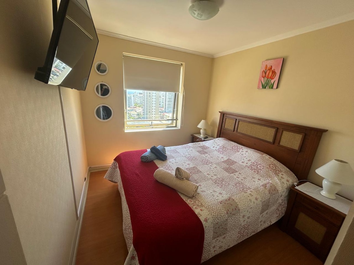Depto. con excelente ubicación. A 2 cuadras del Terminal de Buses de Viña. A 4 cuadras de la Plaza de Viña y a 1 cuadra del metro. Depto. soleado con 2 balcones. Cómodo, muy bien cuidado. Seguridad 24 horas. Estacionamiento subterráneo. Tiene habitación matrimonial, 2 baños, living, cama nido de 1 plaza. Cocina full. Incluye ropa de cama, toallas y otros. Estricta limpieza. Se dejan alimentos como atención al huésped. Piscina disponible durante el verano. Check in y salida libre a convenir.