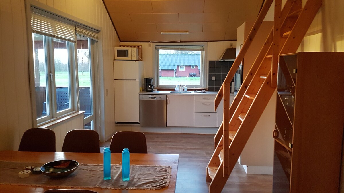 Pequeña y acogedora casa de campo ubicada hasta el encantador bosque y el río, zona muy pintoresca. Hay 2 dormitorios con 2 camas individuales en cada uno, así como un gran loft con dos camas individuales y una cuna. Baño con ducha y calefacción por suelo radiante. Además, cocina-sala de estar con comedor y esquina de sofá. Hay utensilios de cocina, nevera/congelador, lavavajillas, microondas, estufa con horno, cafetera, hervidor eléctrico, etc. Desde la cocina sales a una acogedora terraza de madera donde hay muebles de jardín y una barbacoa de uso gratuito.