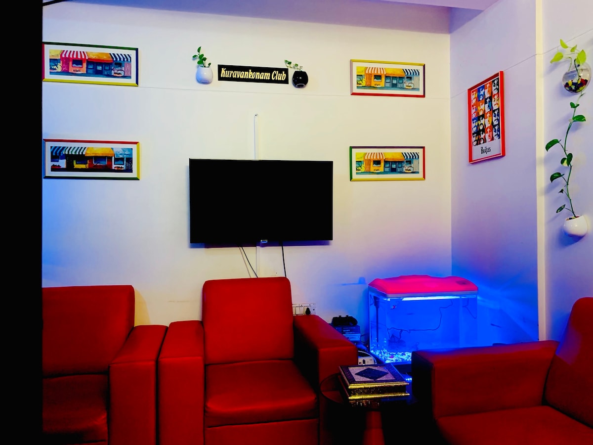 Villa premium de 4 dormitorios y cocina (con aire acondicionado) en el corazón de la ciudad de TVM. Acceso por carretera principal con internet de alta velocidad. Jardín en la azotea con zona de fiesta y gimnasio. Villa a prueba de sonido con inodoros adjuntos. Al reservar 2 huéspedes obtendrán 1 habitación, 4 personas tendrán 2 habitaciones, 6 personas tendrán 3 habitaciones y solo 8 o más obtendrán 4 habitaciones de villa entera. Estacionamiento cubierto para un auto y 2 bicicletas. Cocina modular con las últimas comodidades. Agua presurizada las 24 horas. Sala con TV de55pulgadas por cable Netflix/HD