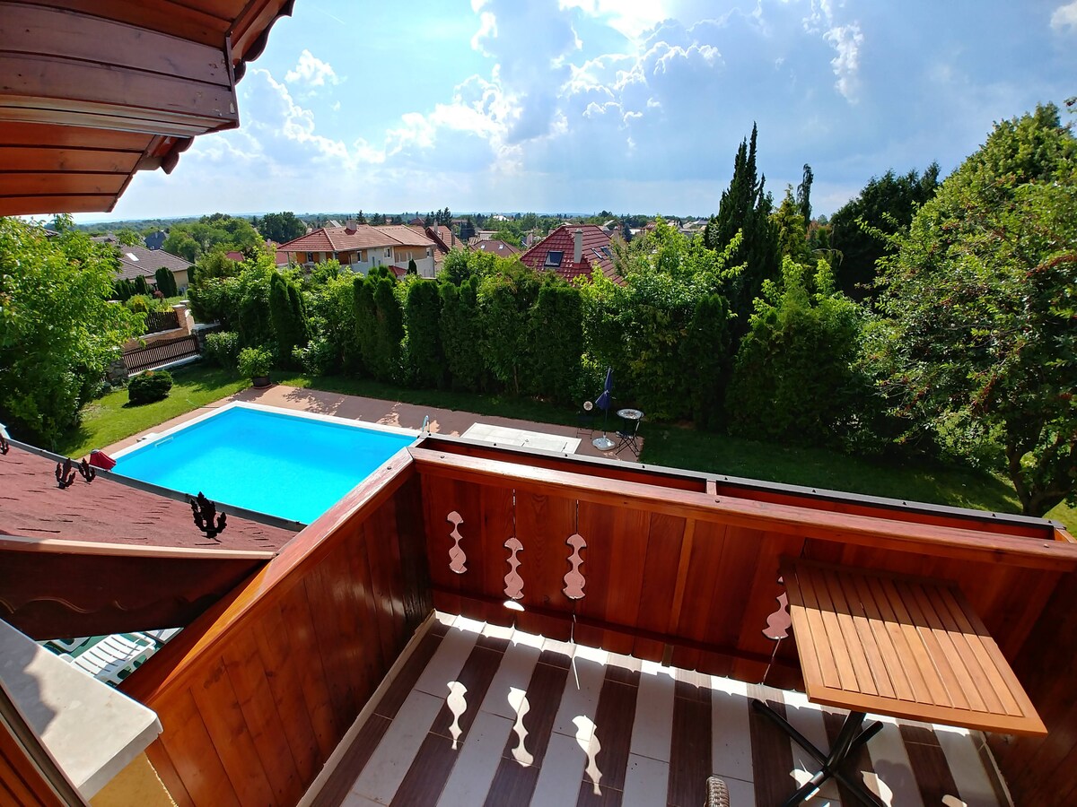Suite en una elegante villa renovada en una zona natural sin ruido junto al soroll. Alojamiento tranquilo para la familia o las parejas. En auto: Hévíz - 10 minutos, Balaton - 14 minutos y Keszthely - 13 minutos. Todo lo que necesitas para pasar un rato relajado con una terraza con brisa y una cocina exterior compartida y barbacoa. Disfruta de tu café y toma el sol en los dos balcones separados con vistas a cada lado de la villa. Observa la naturaleza y los animales cercanos con granjas ganaderas y la torre de vigilancia a pocos pasos.