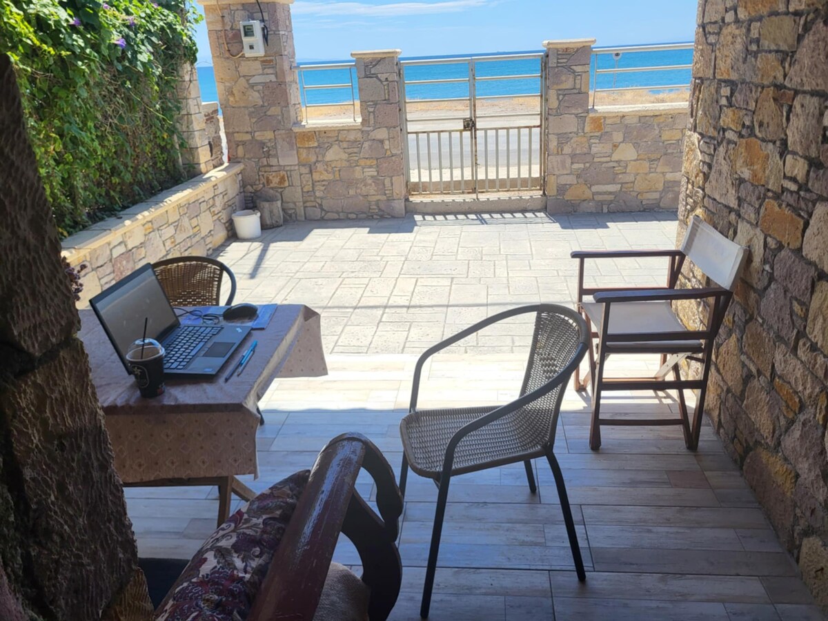 A stone cottage once a farm house opposite the beach with a conservatory and an extra independent stone room . It has a BBQ area with a wood fire oven and a large monastery table . Pick your own vegetables, figs, pears, grapes, apples and peaches which are in the garden. Eat on the beach meters away from the house at tradition fish taverns. You can go into the village and have ouzo with locals ,visit the hot springs, go to the salt pit and observe the pink flamingos.