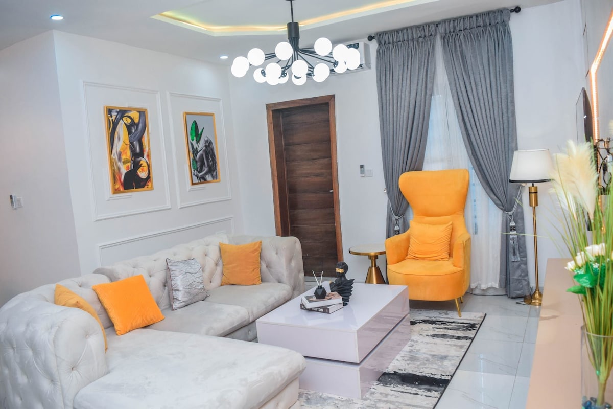 Te damos la bienvenida a Elmstead Luxury Aprt, tu elegante refugio en Lekki Ikota. Este refugio de 2 dormitorios y 2 baños ofrece comodidad de aire acondicionado, un televisor de 65 pulgadas en la sala de estar, televisor de 43 pulgadas en los dormitorios, WiFi ilimitado estable gratuito y energía las 24 horas, los 7 días de la semana con inversor y energía solar. Disfruta de la llegada autónoma con cerradura inteligente, estacionamiento gratuito, una lavadora en la vivienda y un castillo inflable para niños. 1 limpieza gratuita para estadías de más de 5-6 noches. Cerca del centro de conservación de Lekki, Mega Chicken, Blackbell y Blemco. Perfecto para viajeros solitarios, huéspedes de negocios, familias o estancias largas.