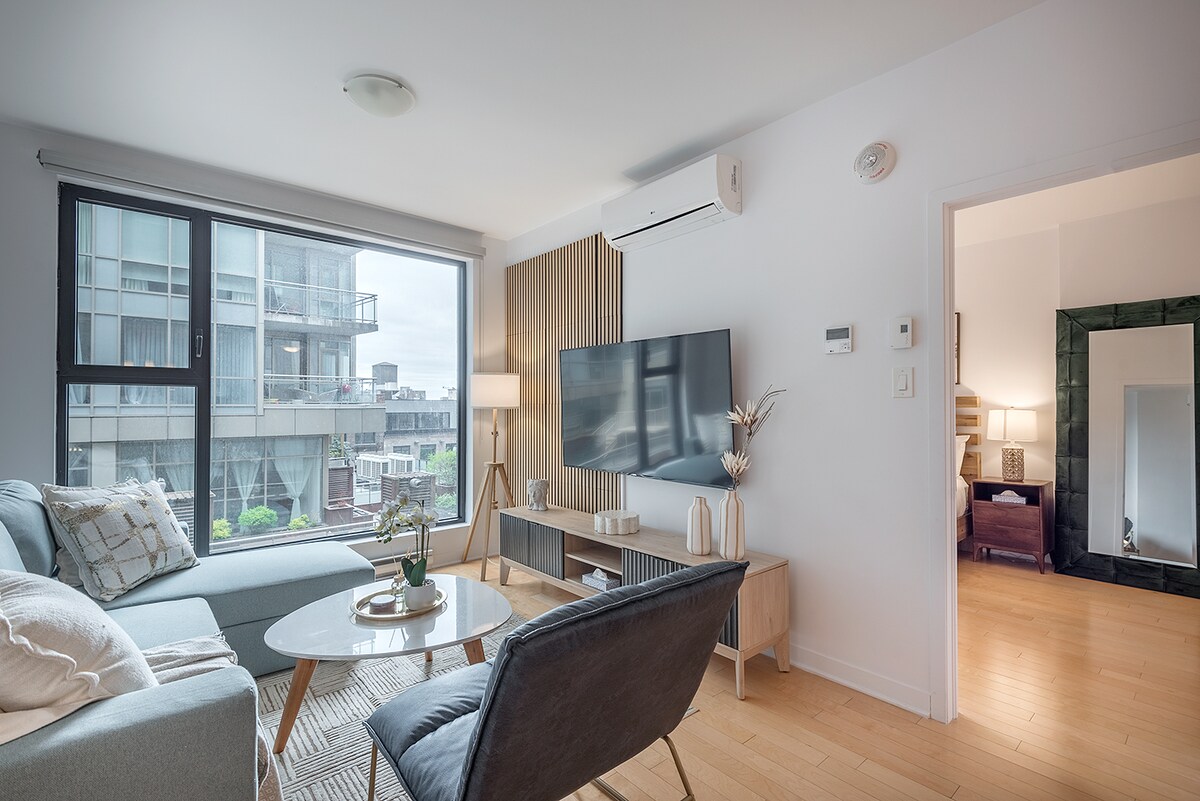 ¡Apartamento situado en pleno centro de la ciudad con acceso directo al Bell Center! Disfruta de tu estancia con lujo y comodidad en un apartamento de un dormitorio totalmente amueblado que incluye café, tostadora, hervidor de agua y todos los utensilios de cocina gratuitos. ¡Sauna, piscina, gimnasio con numerosas pesas y máquinas, salón panorámico, sala de juegos, salón y terraza con múltiples barbacoas a tu disposición! ¡Disfruta de un aparcamiento subterráneo gratuito y de un acceso a 1 minuto al sistema de metro sin tener que poner un pie fuera! Netflix incluido.