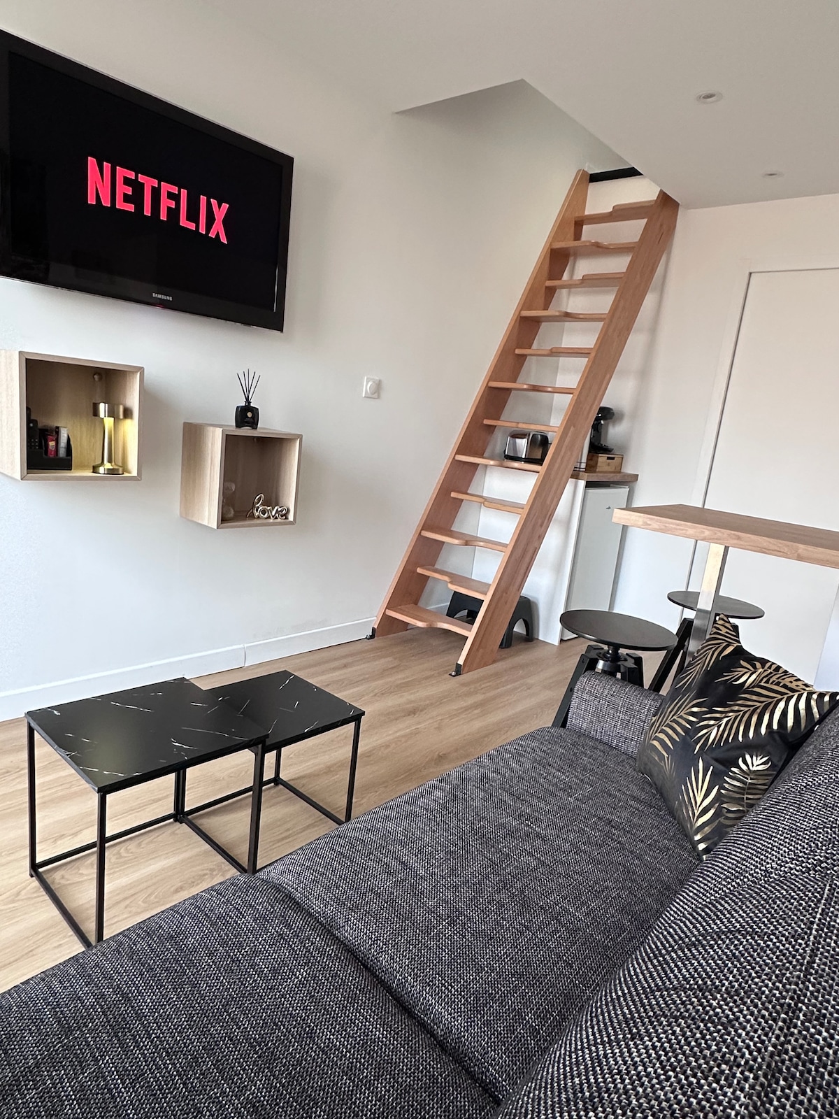 En el corazón de Montaigu, estudio luminoso y totalmente renovado de 26 m². Estación de tren a 7 minutos a pie. Castillo de Tiffauges a 15 min. Clisson a 15 minutos. Puy du Fou a 40 min. Nantes a 25 minutos. Peaje de la autopista A83 (Nantes/Burdeos) a 7 min. Frente al mar a 1 hora. Alojamiento con cocina equipada, vajilla, sofá cama de 2 plazas, tv conectada, wi-fi. Nespresso, hervidor de agua, placa de inducción, microondas con grill. Una cama doble de 140. Cuarto de baño, inodoro, secador de pelo. Se proporcionan sábanas y toallas de ducha.