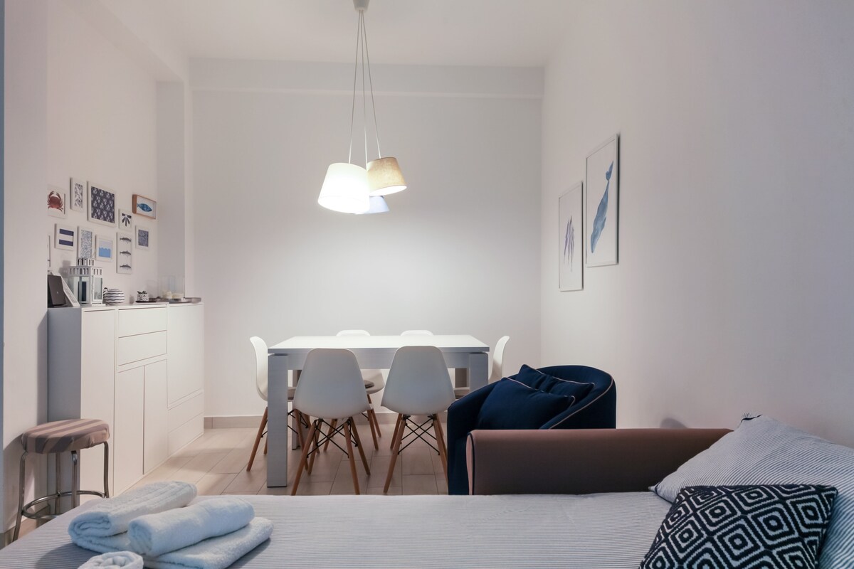 Este acogedor apartamento de una habitación es una pequeña joya de espacio bien aprovechado. La entrada se encuentra en un patio interior en la planta baja. El apartamento está amueblado de forma funcional, con una cocina abierta, una pequeña mesa de comedor, un sofá, una cama y un baño compacto con ducha. A pesar de su pequeño tamaño, el uso inteligente del espacio y la ubicación céntrica lo hacen ideal para quienes trabajan o incluso para los turistas que buscan simplicidad a pocos pasos del mar.