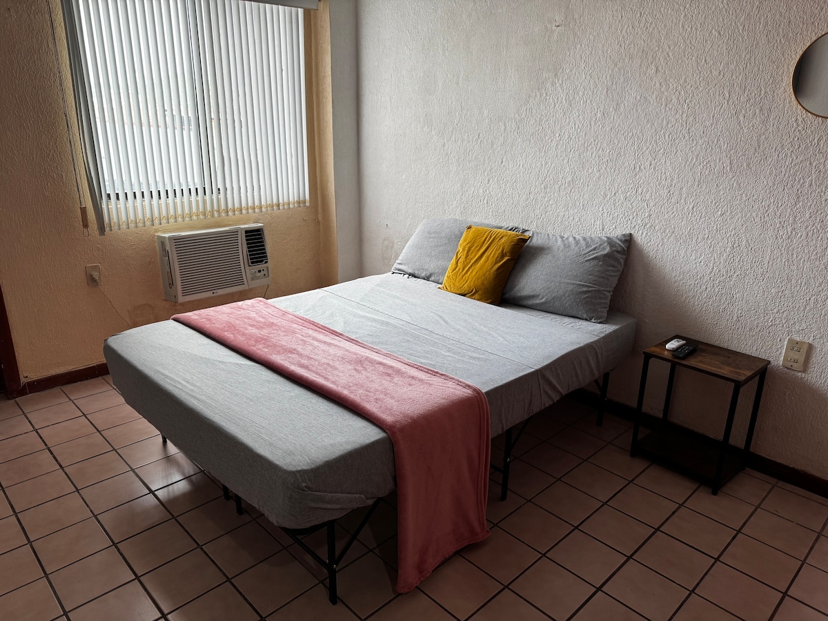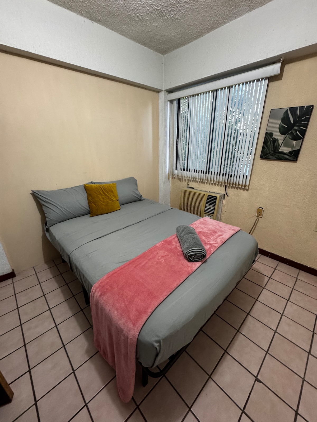 Pequeña habitación hasta para 2 personas se encuentra en un 3 nivel. Esta en un condominio de 3 departamentos con acceso limitado y seguro. La habitación cuenta cama matrimonial, Buro con lámpara, aire acondicionado, ventilador de techo, smart tv de 32”, barra / escritorio con frigobar, microondas, licuadora, parrilla eléctrica, vajilla, cubiertos y vasos para 2 personas, olla y sartén, baño con closet.