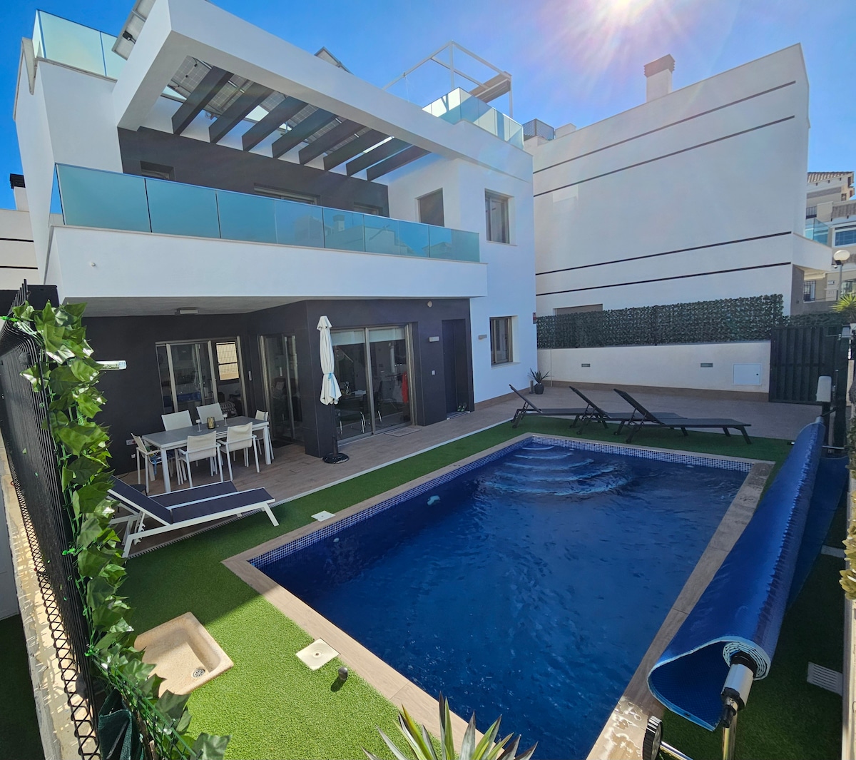 Preciosa casa adosada en una parcela en la esquina (construida en 2017) en Entre Golf Villamartin, con piscina privada calentable, pequeño jardín y terraza orientada al sur. Cocina totalmente equipada, comedor y sala de estar con TV/radio vía satélite, caja fuerte. 2 dormitorios y 2 baños. Aire acondicionado/calefacción. Azotea solarium con grupo salón, mostrador de cocina y pérgola, sistema de alarma, parcela cerrada con parking.
