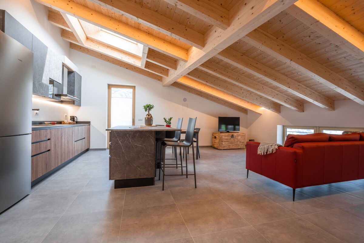 L'appartamento moderno e accogliente con parcheggio privato recintato gratuito, garage per bici e attrezzatura e ampio giardino con bbq e gazebo. Situato al 2° piano con ingresso autonomo, camera con 3 posti letto, open-space con cucina e soggiorno con divano letto matrimoniale, bagno finestrato con doccia walk-in e ampio balcone vista montagne. Attrezzato di lavastoviglie, lavatrice, macchina Nespresso, Wi-Fi e Smart TV. Ospita fino a 5 persone.